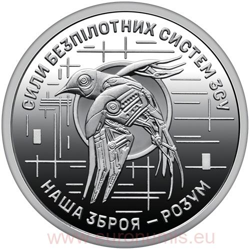 Táto minca oslavuje samostatnú zložku armády, ktorá zohráva kľúčovú úlohu v modernom vojnovom konflikte. Bezpilotné letecké sily (UAVF) ukrajinských ozbrojených síl systematicky využívajú vzdušné, námorné a pozemné bezpilotné a robotické systémy na vykonávanie širokej škály bojových misií v asymetrickej konfrontácii. Táto minca vzdáva hold príspevku personálu UAVF k obrane územnej celistvosti Ukrajiny a symbolizuje inovácie, technologickú prevahu a inteligenciu ukrajinskej armády.