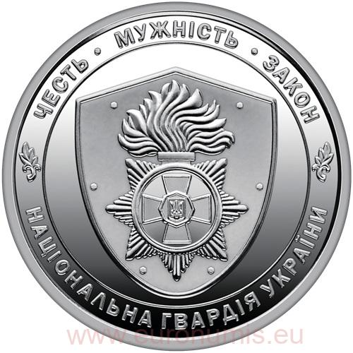 Ručná strana: po obvode sú nápisy, ktoré predstavujú základné hodnoty – ЧЕСТЬ, МУЖНІСТЬ, ЗАКОН (česť, odvaha, zákon) (hore) a НАЦІОНАЛЬНА ГВАРДІЯ УКРАЇНИ (Národná garda Ukrajiny) (nižšie). Hlavným prvkom kompozície je vyobrazenie baretového odznaku Národnej gardy Ukrajiny, ktorého základom je rovný rovnostranný kríž s rozbiehajúcimi sa koncami. V strede kríža sa v osemuholníku nachádza malý štátny znak Ukrajiny. Na pozadí mince je symbolický štít, ktorý predstavuje ochranu a bezpečnosť.