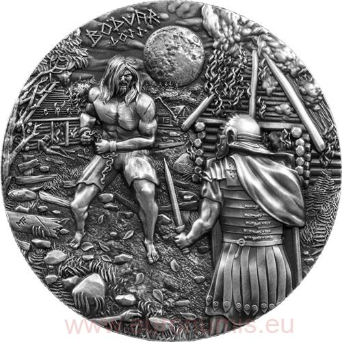 Lícna strana mince zachytáva okamih Bödvarovho prebudenia po útoku na jeho dedinu. Bojovník, spútaný ťažkými reťazami a obklopený rímskymi legionármi, sa dvíha zo zeme uprostred ruín a plameňov. V jeho pohľade je vidieť rastúci hnev a odhodlanie, zatiaľ čo jeho napäté svaly predznamenávajú silu, ktorá čoskoro zlomí jeho putá. Dynamická kompozícia a ultra vysoký reliéf zdôrazňujú drámu scény a zobrazujú práve ten moment, keď sa rodí nezastaviteľná vôľa bojovať.