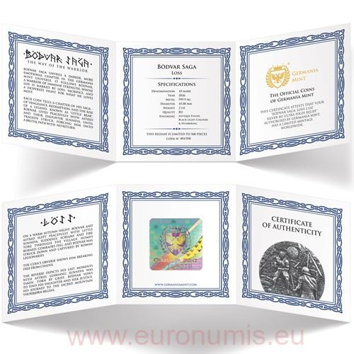 Hrdinom prvej mince zo série Bödvar Saga od Germania Mint je Bödvar – bojovník, ktorého osud je poznačený tragédiou, zúrivosťou a neochvejným odhodlaním. Minca 2026 Bödvar Saga: Loss 2 oz Silver BU Ultra High Relief otvára epický príbeh o ceste bojovníka vedúcej k posvätnej hore Thorbjørn. Dizajn od Mateusza Frąckowiaka, razený v ultra vysokom reliéfe, zdôrazňuje drámu a emocionálnu silu Bödvarovho príbehu a dodáva scénam mimoriadnu hĺbku a dynamiku. Razba mince 2026 Bödvar Saga: Loss 2 oz Silver BU Ultra High Relief je limitovaná na 500 kusov, každý je zabalený vo vrecku, spolu s certifikátom pravosti.