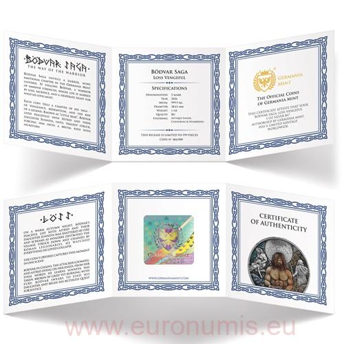 Hrdinom tejto výnimočnej mince zo série Bödvar Saga od Germania Mint je Bödvar – neporaziteľný bojovník, ktorého život navždy zmenila tragédia a honba za spravodlivosťou. Strieborná minca Bödvar Saga: Loss Vengeful 1 oz BU z roku 2026 oslavuje dramatický príbeh, odvahu a nezdolného ducha legendárneho bojovníka. Minca, ktorú navrhol Mateusz Frąckowiak, zdôrazňuje hrdinstvo a emocionálnu drámu Bödvarovho sveta. Razba je prísne obmedzená na 999 kusov. Každá minca je dodávaná v kapsule a etue, spolu s certifikátom pravosti, ktorý zaručuje jej výnimočný charakter a numizmatickú hodnotu.