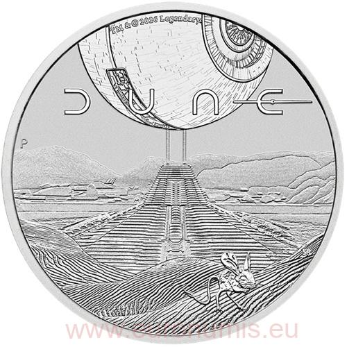 Dollar 2026 Tuvalu BU 1 Oz Ag, Dune je zberateľská edícia inšpirovaná ikonickým sci-fi románom Duna od Franka Herberta. Príbeh Paula Atreida, odohrávajúci sa na púštnej planéte Arrakis, patrí medzi najdôležitejšie diela špekulatívnej fikcie a bol sfilmovaný v mnohých filmových adaptáciách vrátane oceňovaných produkcií od Legendary Entertainment. Minca je razená zo striebra Ag .9999 s hmotnosťou 1 trójska unca (31,107 g) a priemerom 40,9 mm. Má nominálnu hodnotu 1 tuvaluský dolár a je zákonným platidlom vydaným v mene Tuvalu. Razba je obmedzená na 10 000 kusov. Každá minca je dodávaná v akrylovej ochrannej kapsule. Emisia odkazuje na svet Arrakis – planétu, ktorá je jediným zdrojom mimoriadne cennej látky známej ako melanž. Konflikty o kontrolu nad týmto zdrojom a osud rodu Atreidovcov tvoria epický príbeh o moci, osude a odvahe tvárou v tvár neznámemu.